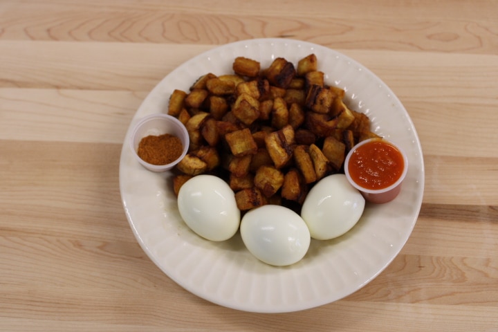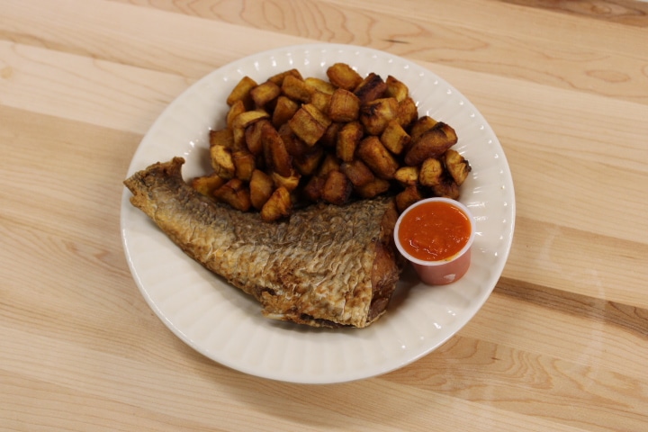 Ce plat africain populaire et savoureux se compose de tranches de bananes plantains frites saupoudrées de sel et d’épice. Il est ici accompagné de poulet braisé.